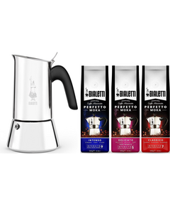 Discover the Bialetti Moka Express 6 cup + Perfetto Moka Intenso coffee 250 grams The Bialetti Moka Express 6 cup is a globally recognized and beloved coffee maker. With its distinctive octagonal aluminum pot, you can make delicious coffee in an authentic way. The usage is simple: fill the...